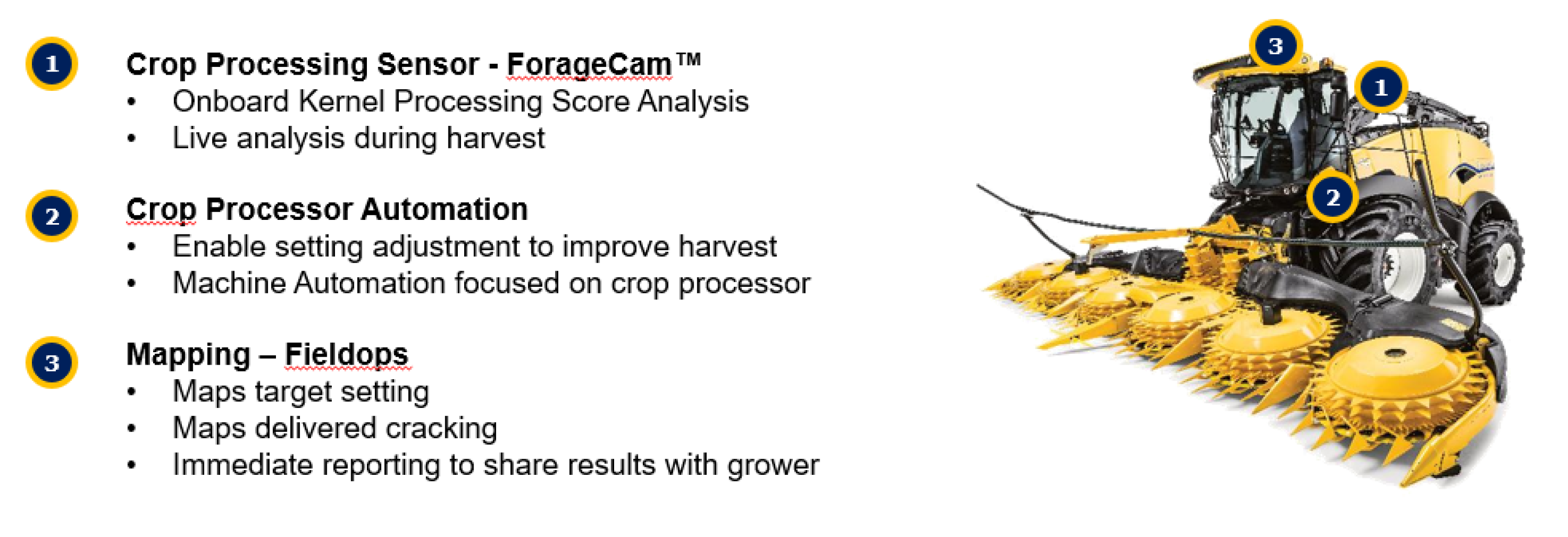When chopping corn, the kernels must be crushed sufficiently to make the starch easily digestible. Because this crushing process requires a lot of energy, the machine must be optimally adjusted to achieve good feed quality with optimal machine performance. Currently, however, this quality control is still carried out by sampling and laboratory analyses, the results of which are only available after the harvest. NEW HOLLAND's ForageCam™ analyzes the grain processing score during harvesting based on images of the chopped corn flow. If the measured grain processing score deviates from the value set by the operator, the machine settings are automatically adjusted to achieve the desired value. This sensor therefore enables the chopper and the driver to intervene during harvesting by optimizing the machine settings to achieve the desired feed quality in an efficient manner.